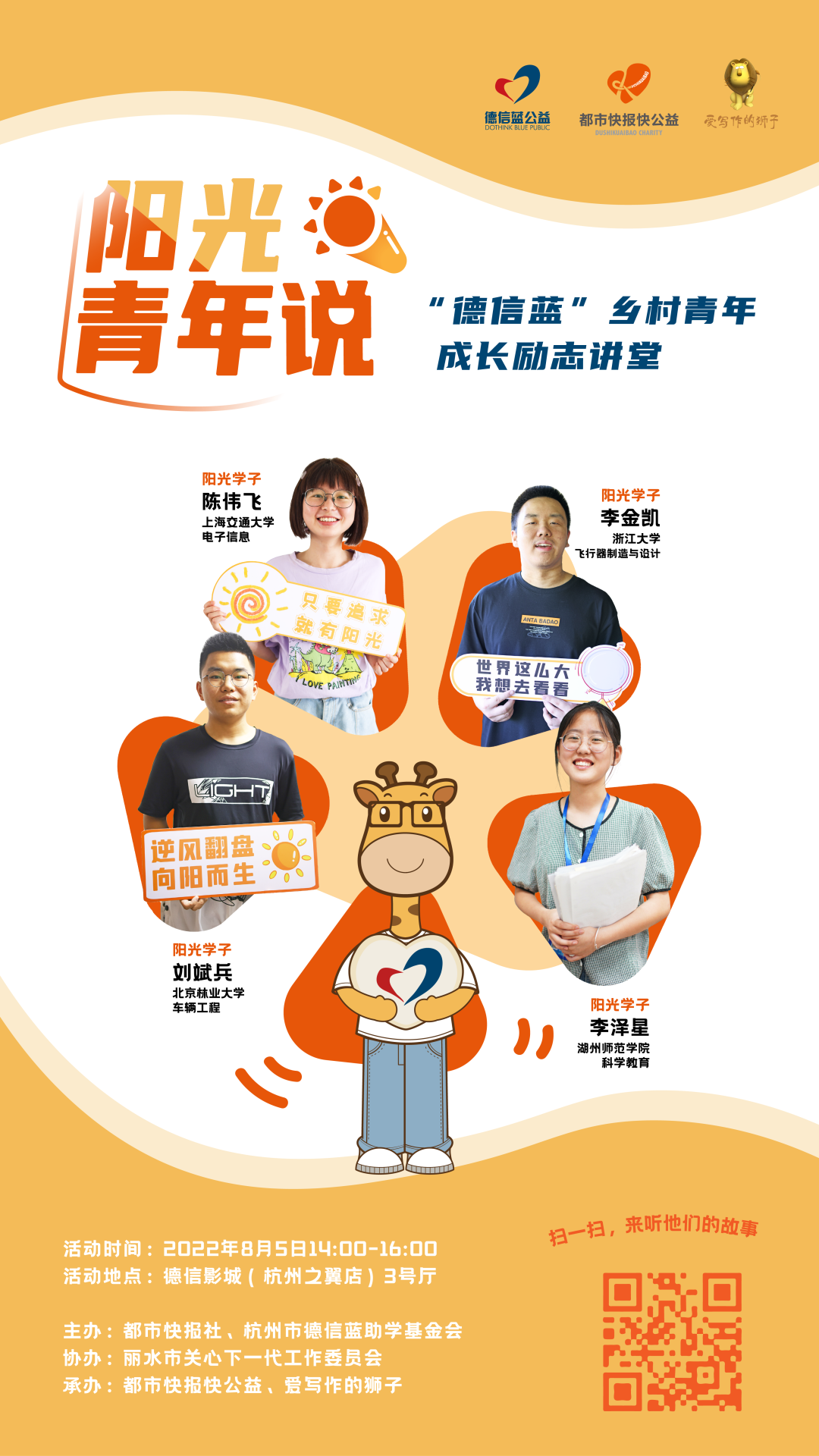 这周五,2022都市快报阳光助学行动衍生项目“阳光青年说·‘德信蓝’乡村青年成长励志讲堂”即将开讲。丽水缙云学子李金凯、青田学子刘斌兵、庆元学子陈伟飞和衢州龙游学子李泽星4位阳光青年将在现场讲述自己的故事。