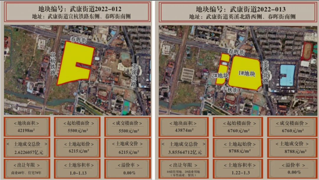 13#地块位于武康街道英溪北路西侧、春晖街南侧,容积率为1.22-1.3,其中1#地块是商住用地、2#地块是商业用地(零售商业、餐饮),住宅出让年限为70年,商业出让年限为40年,出让面积43874m²。