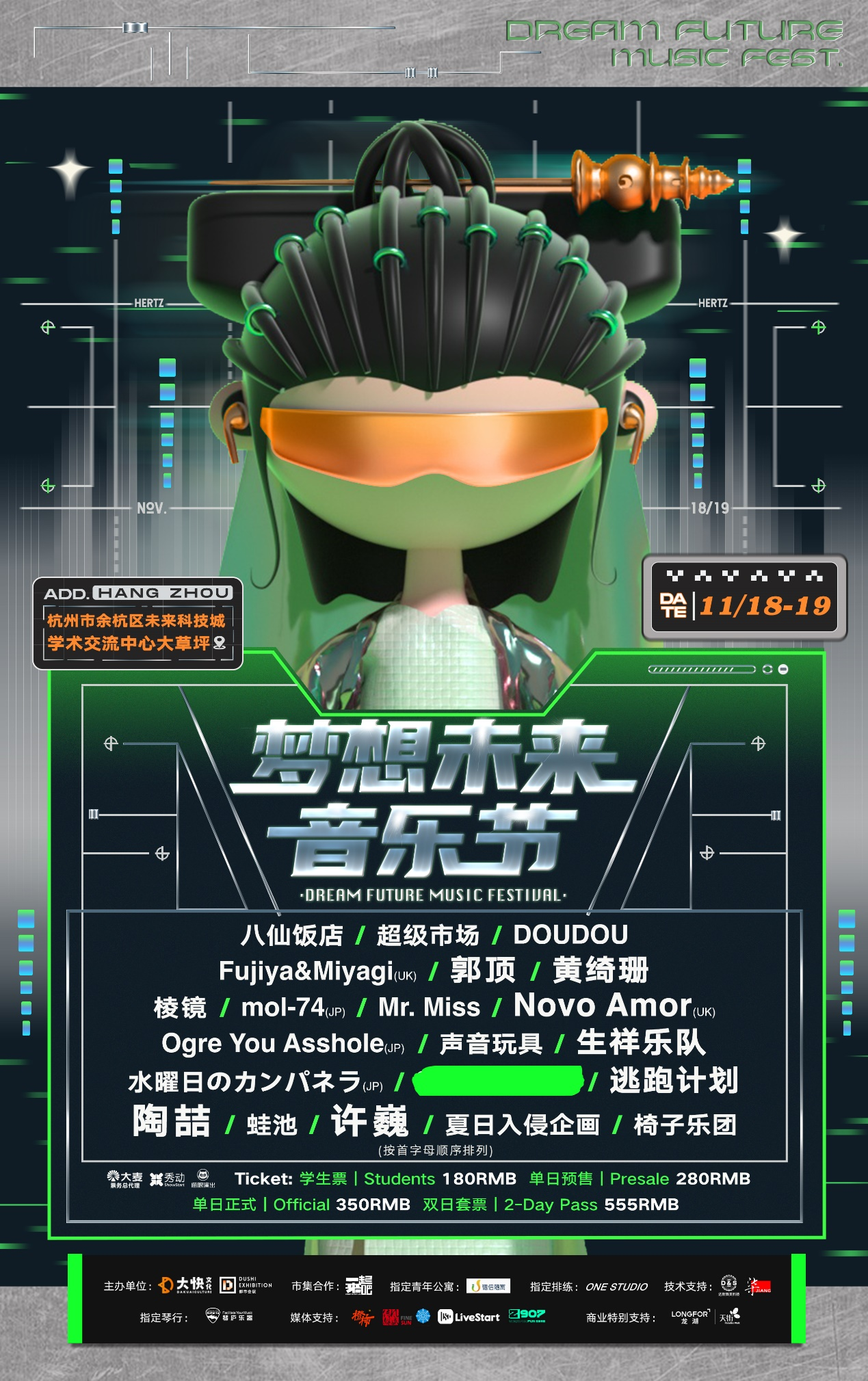 我们怀揣着梦想并踏上新的旅程,11月18日-19日,陶喆、许巍、黄绮珊、郭顶、生祥、超级市场、逃跑计划、声音玩具、Fujiya & Miyagi、Novo Amor、Mr. Miss等共计22组音乐人与你一起,相聚杭州市余杭区未来科技城学术交流中心大草坪,一起共向未来!