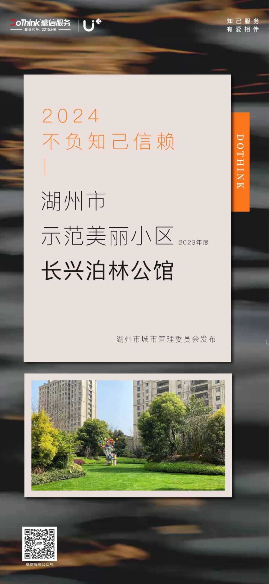 星光不负赶路人。近日,湖州市城市管理委员会发布《关于命名2023年度湖州市“美丽小区”“美丽街巷”的通报》,德信服务在管的湖州市泊林公馆正式获评湖州市示范美丽小区称号,这也是继去年时代公馆等5个项目同时获评后,我们再获这一荣誉。